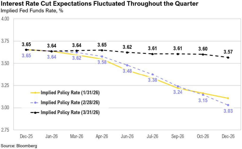 path fluctuated throughout the quarter, ranging from two 0.25% cuts to a small probability of a 0.25% hike, but ultimately converged with the Fed’s guidance for no cuts in 2026.5