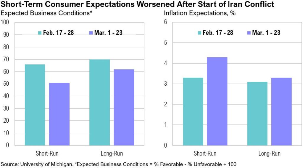 barrel. The U.S. Energy Information Administration (EIA) has projected that the conflict will not extend significantly beyond April.18 Betting market probabilities suggested it will conclude by May 31.19 The EIA expects production shut-ins to peak in April before declining through the second half of the year. Retail fuel prices are expected to normalize, but not until year end.18 The slow normalization of energy prices is often referred to as a “rockets and feathers” effect. For example, fuel prices rise rapidly when crude oil increases, but fall more slowly when it declines. The lag is driven by both physical supply chain mechanics (since it typically takes four to six weeks for crude to be refined, distributed, and sold as gasoline) and retailer behavior.20