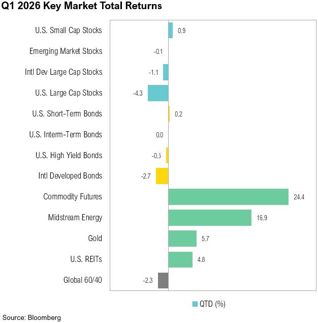 from AI dominance shaped first-quarter returns. U.S. large-cap stocks (as proxied by the S&P 500 Index) closed at a new all-time high on January 27, but ended the quarter down 4.3%. U.S. small-cap stocks, as represented by the Russell 2000 Index, fared better, finishing the quarter up 0.9%. U.S. intermediate-term bonds (the Bloomberg U.S. Aggregate Bond Index) ended the quarter flat.