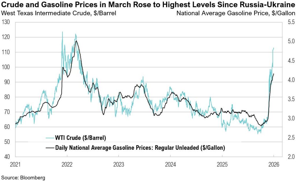 ■ U.S.–Israeli strikes on Iran effectively closed the Strait of Hormuz. Crude oil surged from $57 to $101 per barrel in March. This pushed U.S. fuel prices to four-year highs, amplifying inflationary pressures.