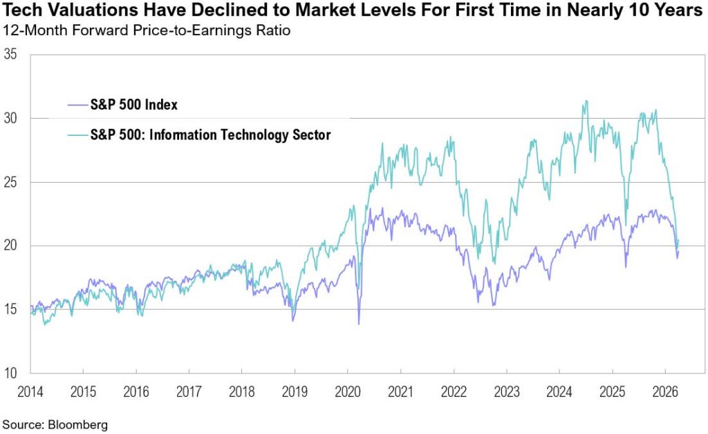 valuations decreased meaningfully. For example, Nvidia’s 12-month forward price-toearnings ratio declined to 18.8x at the end of the quarter, its lowest level in at least five years.30 Valuation compression occurred over the quarter, even as earnings expectations strengthened, rising from 29% at the end of 2025 to 37% growth for 2026 by the end of March. The tech sector is expected to deliver the strongest revenue growth across the S&P 500 in 2026 (23%), and positive guidance (64%) remains well above historical averages (32%).8